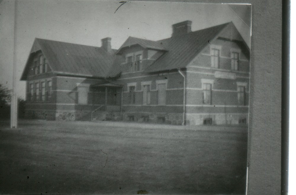 Bilden föreställer en ensamliggande tvåvåningsbyggnad i vinkel omgiven av gräsmatta. Där står också en flaggstång.