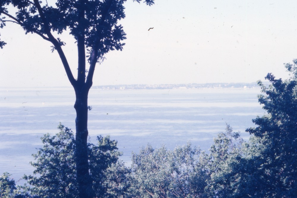 Bilden föreställer utsikt över sundet från Pålsjöskog. En trädstam i kanten av bilden. På bilden står det Gökotta 79.
