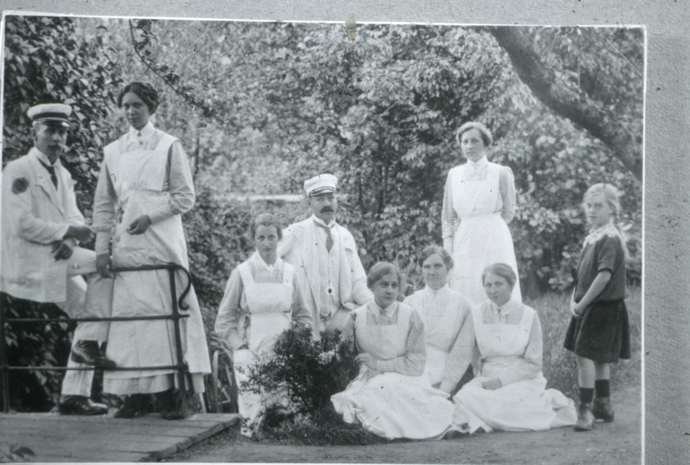 Bilden föreställer stående och sittande på huk, två män i ljuskavaj och hatt samt sex kvinnor i sköterskekläder samt en flicka i mörk klänning. Till vänster veranda golv. I bakgrunden trädgård med gräsmatta och träd.