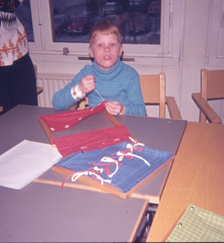 Bilden föreställer ett rum med bord där det sitter ett barn som syr på ett tyg som sitter i en ram, ytterligare en ram ligger på bordet.
