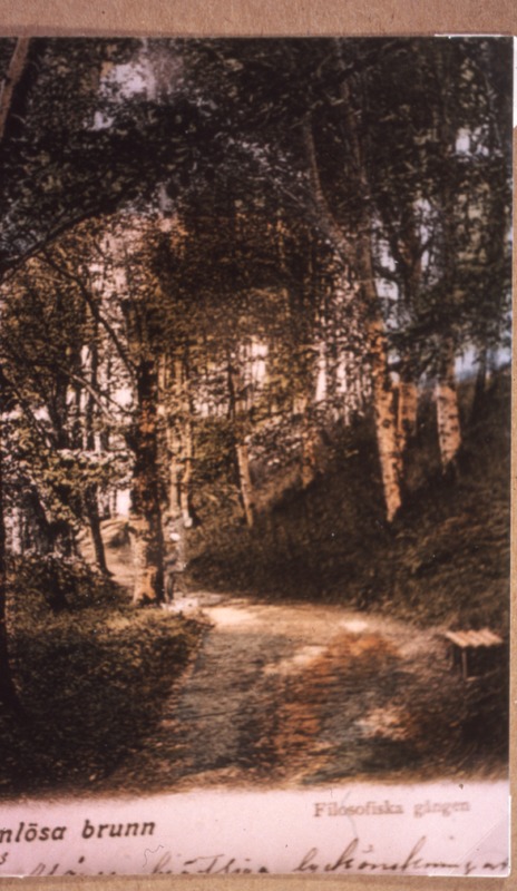 Bilden föreställer ett parkområde med måmga björkar. En väg löper genom bilden. Under bilden står det "Ramlös brunn, filosofiska gången".