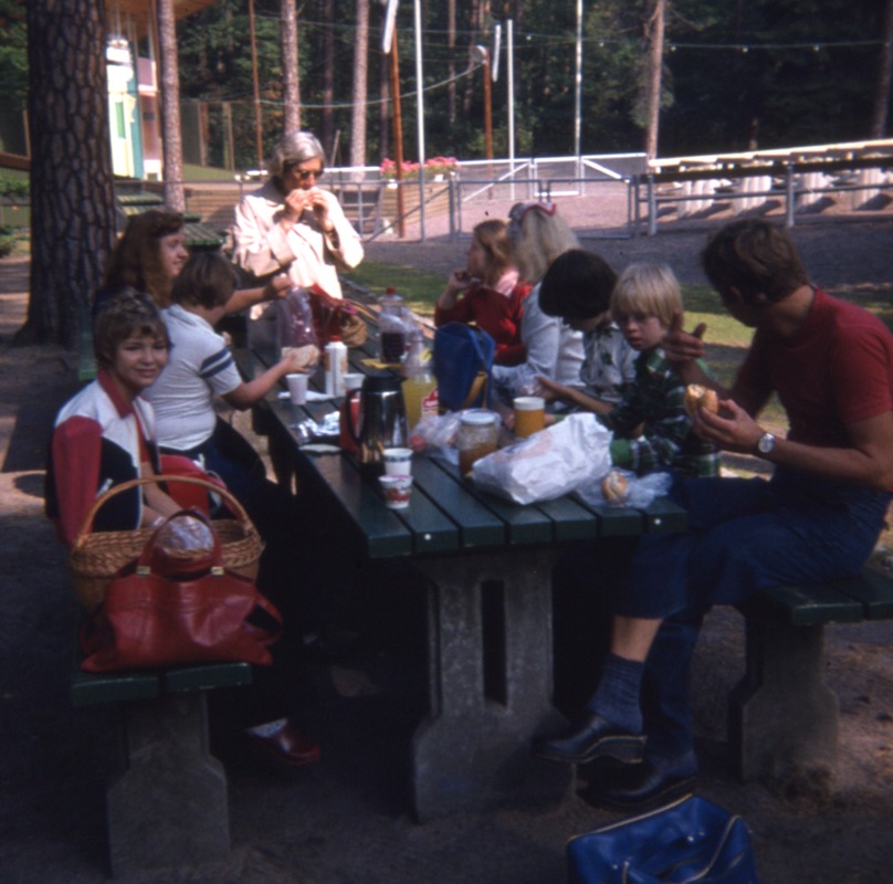 Bilden föreställer en park med kombinerat bord och bänk. Där sitter barn och lärare och äter matsäck. Bland annat står där en korg, termosar, muggar, flaskor och påsar. I bakgrunden staket och träd.