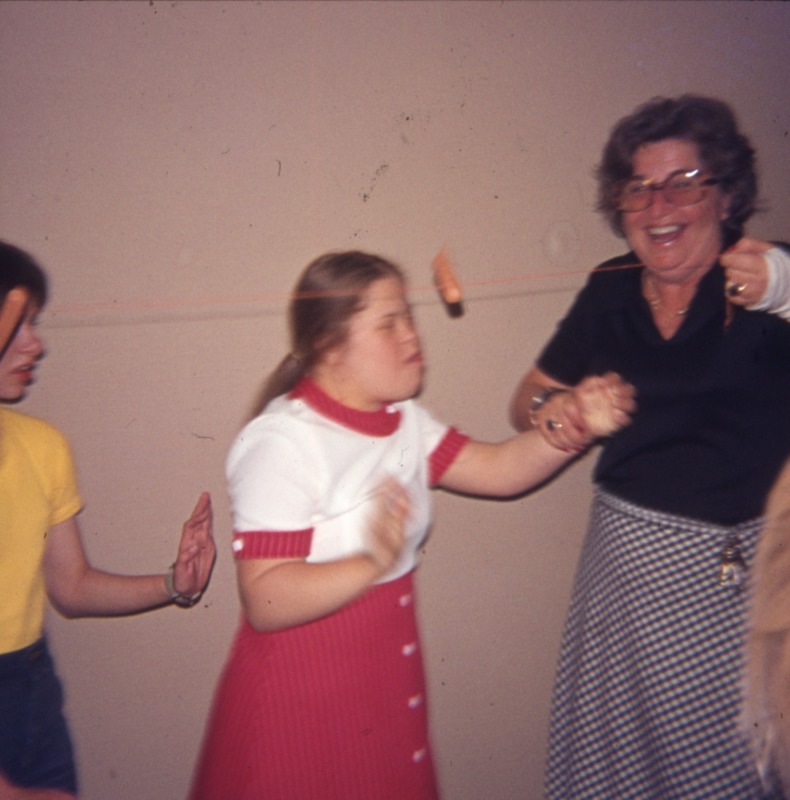 Bilden föreställer ett utrymme, korridor. Där står en lärare och håller i ett snöre som det hänger korvar på. Ett barn försöker äta upp den ena korven. I bakgrunden ytterligare ett barn.