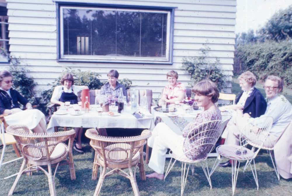 Bilden föreställer en grupp människor som sitter i ett trädgårdsmöblemang, i en trädgård framför del av villafasad och dricker kaffe. På bilden står det Examenskaffe hos Brita Lundin 1979.