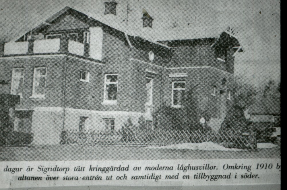 Bilden föreställer en tvåvåningsbyggnad, villa omgiven av trädgård och staket. Det är ett foto av ett tidningsurklipp. Under bilden står det "dagar är Sigridtorp tätt kringgärdad av moderna låghusvillor. Omkring 1910 xxx altanen över stora entrén ut och samtidigt med en tillbyggnad i söder."