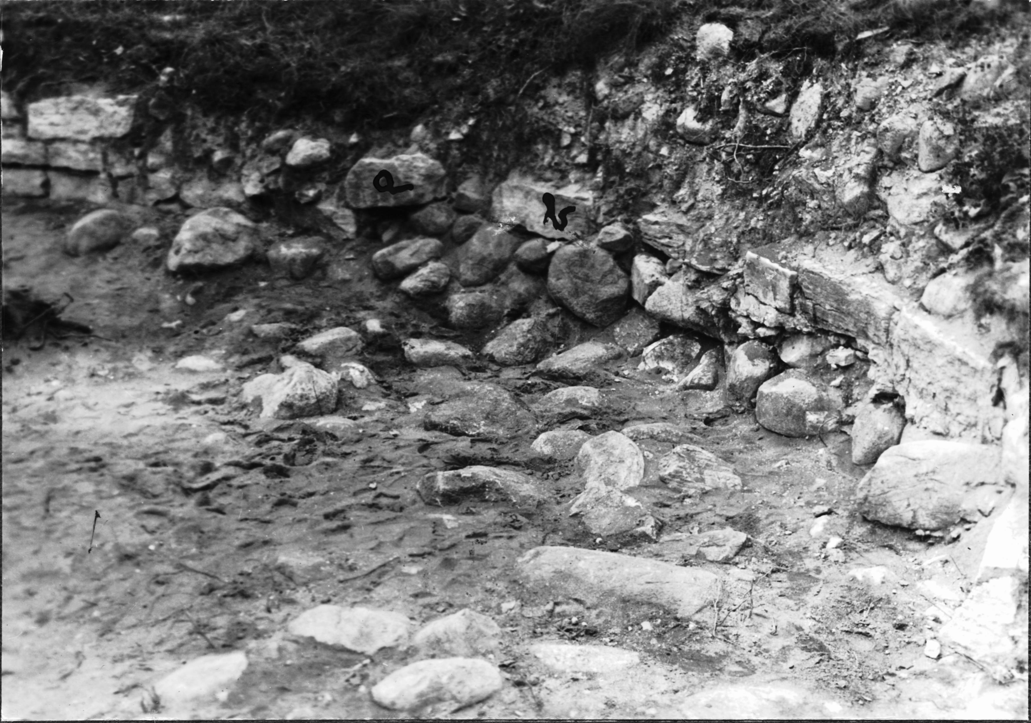Västra delen av kastalens hålrum efter utgrävning. I botten gråsten tillhörande stenpackningen. Från nordost.