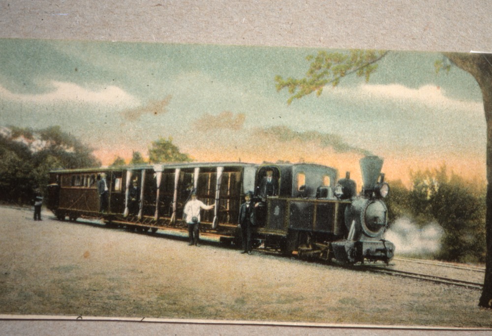Bilden föreställer målning av ett ånglok och två järnvägsvagnar stående på ett spår i parkmiljö, öppen yta framför och träd bakom. Vid tåget står människor troligen bland annat konduktör och lokförare.