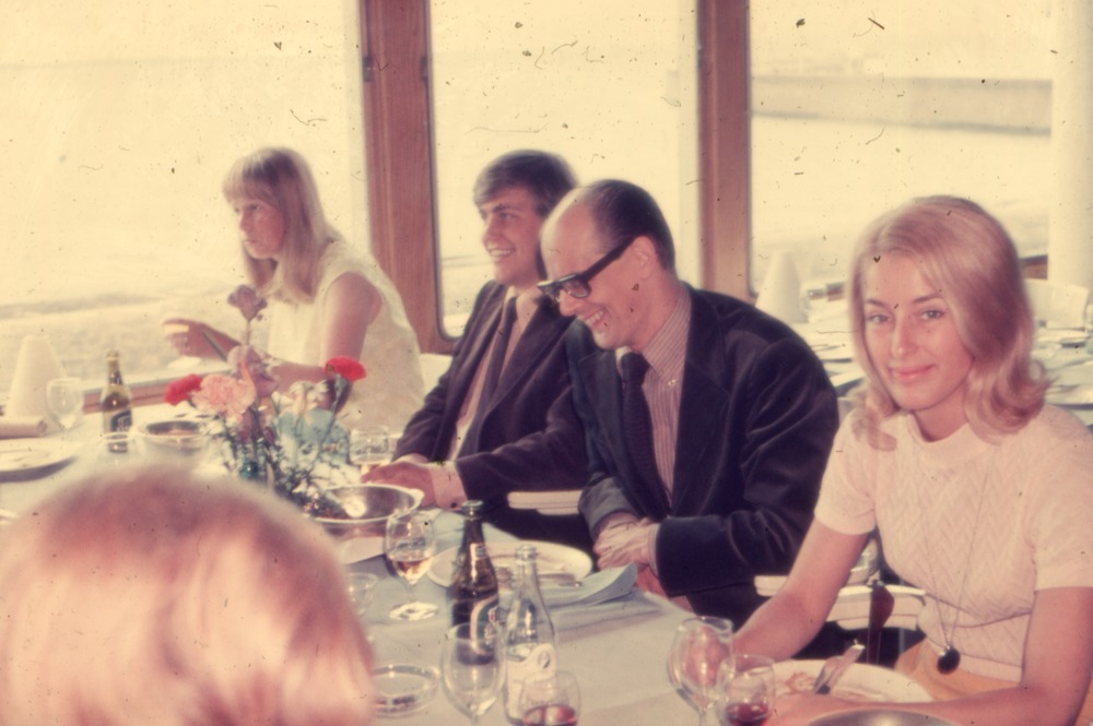 Bilden föreställer ett långbord inomhus där det sitter kvinnor och män. Bordet är dukat med matservis och glas. Där står ölflaskor och en blombukett . I bakgrunden fönster. På bilden står det examenslunch, Parapeten 11-6-71.