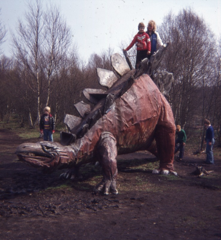 Bilden föreställer en del av Dinoland i Nyvång utanför Åstorp. Man har skapat glasfiber dinosar och placerat dem i en park. Mitt i bild en dinosaurie i originalstorlek på en gräsmatta. Uppe på dinosaurien två barn och på marken tre barn. I bakgrunden träd.