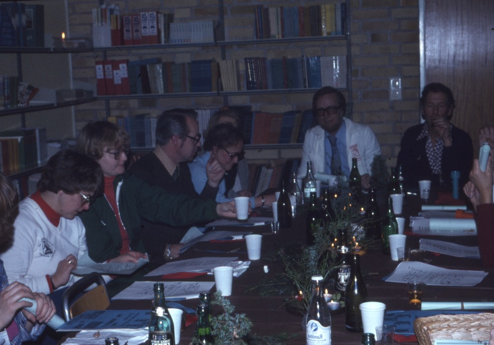 Bilden föreställer människor som sitter vid ett långbord som är dukat med muggar och flaskor med dryck. Alla har också ett texthäfte framför sig. Där är också juldekorationer. På bilden står det jag avfiras före pensioneringen. I förteckningen står det avskedskaffe, FEST.