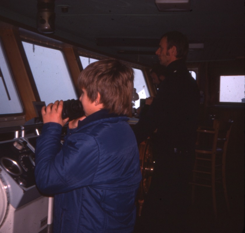 Bilden föreställer interiör från kontrollrum på färja. En kapten står vid spakarna. Ett barn står med kikare. I bakgrunden fönster. På en lapp i asken står det LB-färjan, Sinisia och Zavisa.