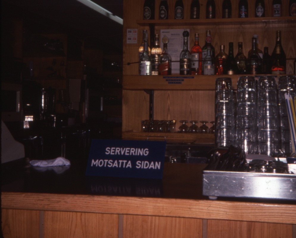 Bilden föreställer en bardisk med glas och flaskor i en servering. På en skylt står det "servering motsatta sidan". På en lapp i asken står det LB-färjan, Sinisia och Zavisa.