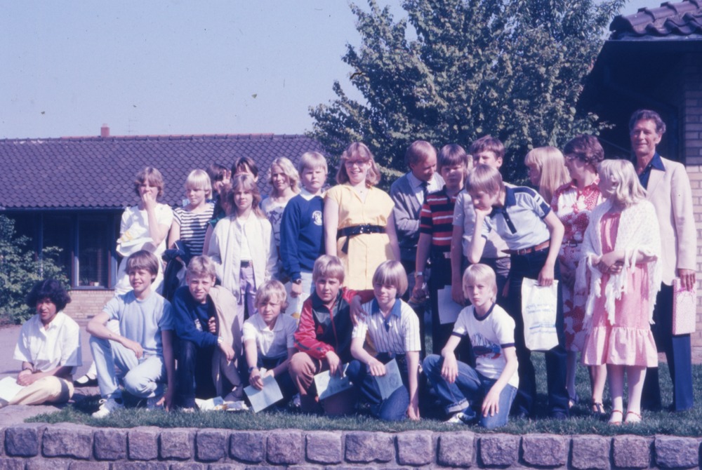 Bilden föreställer en skolklass uppställda för porträttfoto med lärare framför skolbyggnad. Några barn håller papper i händerna. På bilden står det Klass 5 Ri Avsltni dagen 6/6 1980.