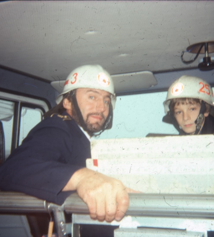 Bilden föreställer en kvinna och en man i huvudformat som sitter i någon form av fordon. De är klädda i uniform och hjälm.