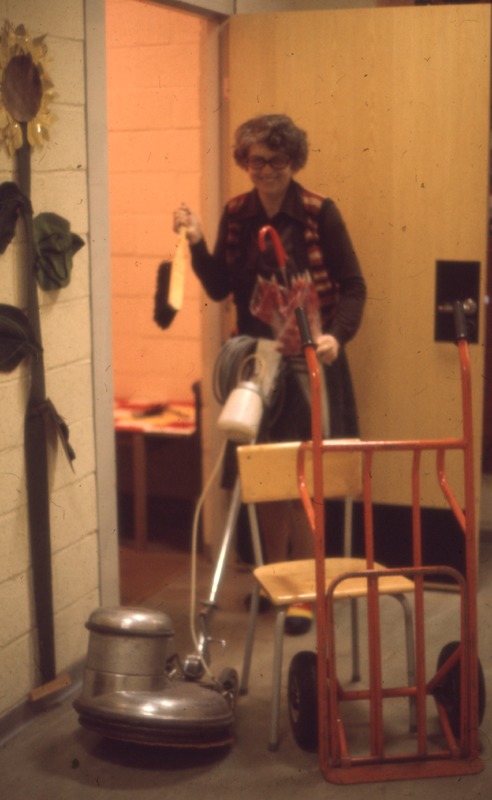 Bilden föreställer en hörna i ett rum. Där står en kvinna med en dammsugare samt en stol och en säckakärra. På väggen en snidad solros.