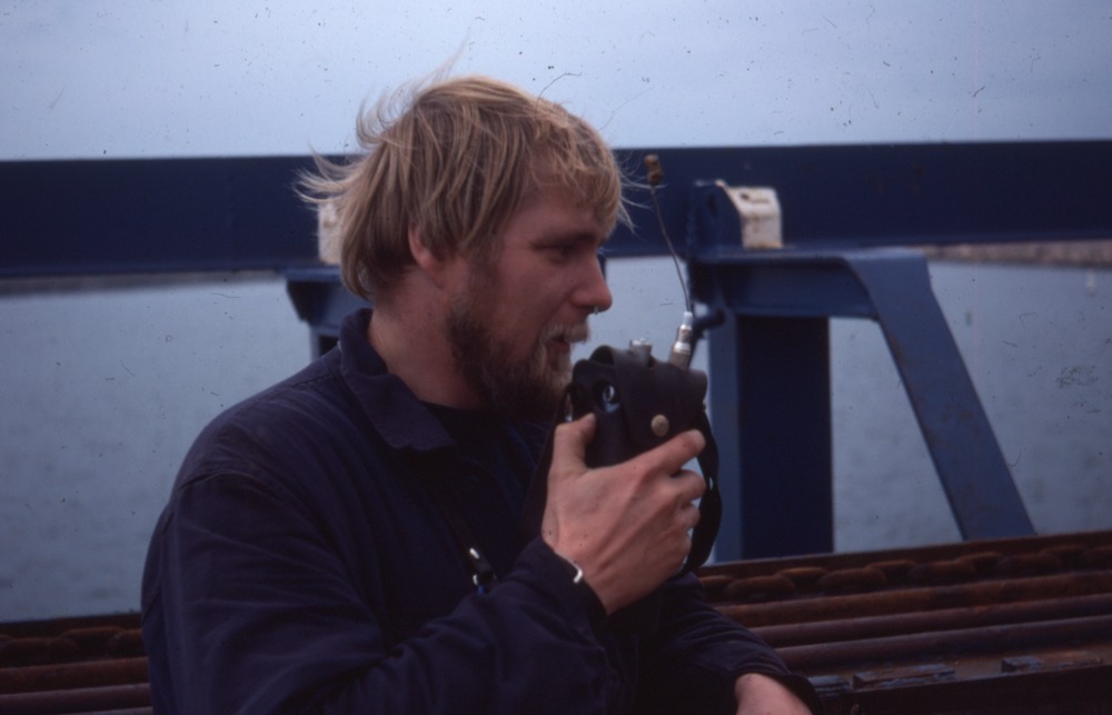 Bilden föreställer en man i bröstformat troligen vid relingen på en båt. Han håller troligen i en Walkie-talkie.