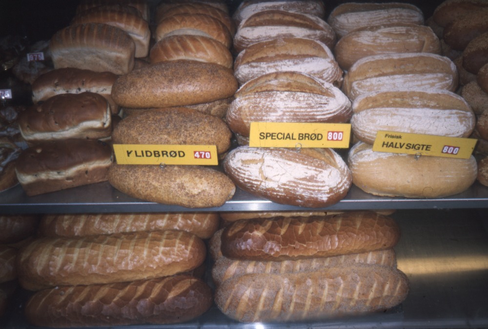 Bilden föreställer hyllor med bröd i en butik. På skyltar står det "Xlibröd 470, specialbröd 800, Frisisk halvsigte 800"