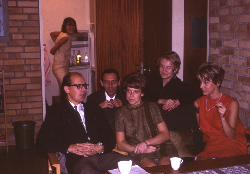 Bilden föreställer fem personer som sitter vid ett bord med kaffekoppar.Ytterligare en kvinna står i ett kök i bakgrunden. En kvinna röker. I förteckningen står det Kollegiefest nov.