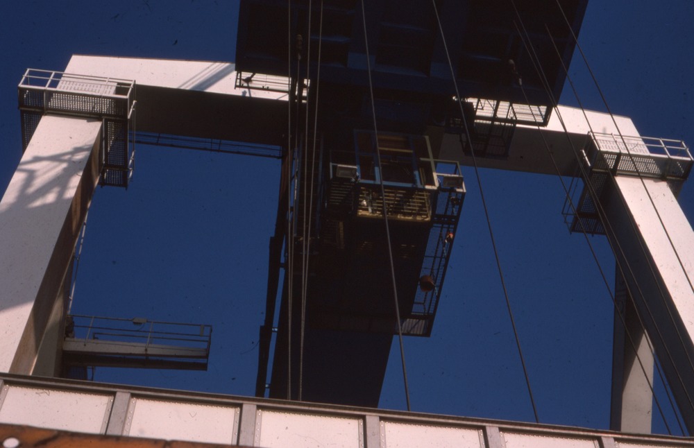 Bilden föreställer troligen del av lyftkran för containrar. Fyrkantig ställning med hissanordning.