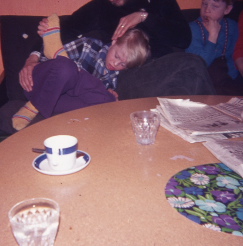 Bilden föreställer ett rum med bord och soffa där ett barn har somnat i famnen på en lärare. På bordet står det glas och en kaffekopp.