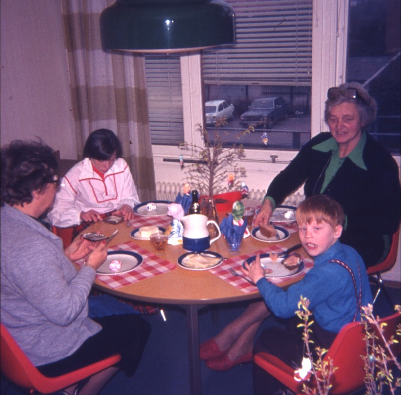 Bilden föreställer ett rum med bord och stolar där det sitter två barn och två lärare och äter på tallrikar. I glasen står blåa servetter.