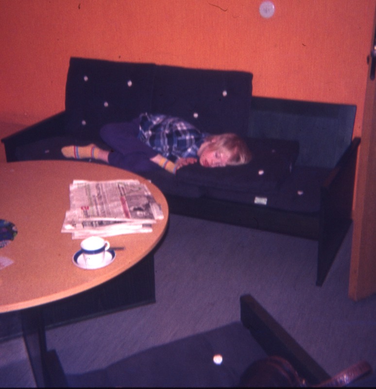 Bilden föreställer ett rum med bord och soffa där ett barn har somnat. På bordet står det en kaffekopp och där ligger en tidning.