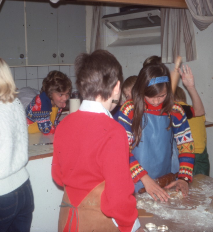 Bilden föreställer ett bord och en bänk i ett kök. På bordet tar två barn i förkläde ut pepparkakor med mått. I bakgrunden fler barn.