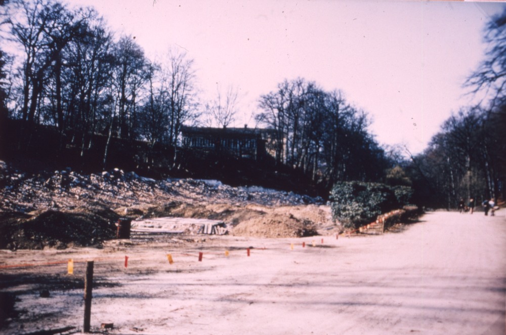 Bilden föreställer till höger en väg och till vänster ett vägarbete eller grustag avgränsat med ett rep med röda och gula brickor. I bakgrunden träd och man skymtar en byggnad.