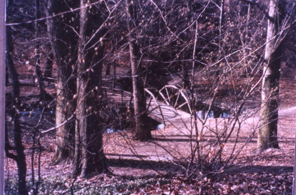 Bilden föreställer en park med träd och gångbanor. Mitt i bild en bro över ett vattendrag. Troligen vårbild.