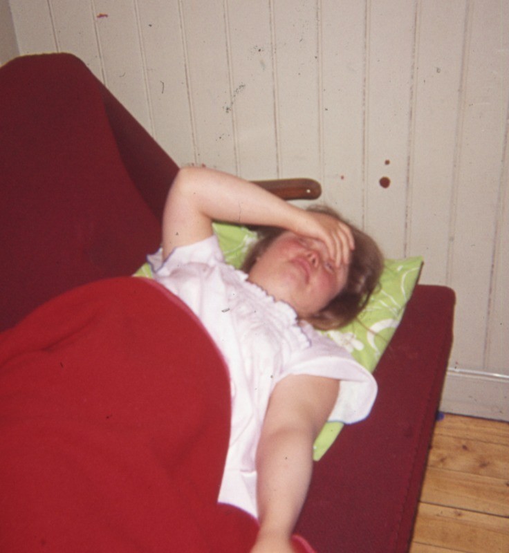 Bilden föreställer ett rum med en soffa där ett barn har somnat under en filt.
