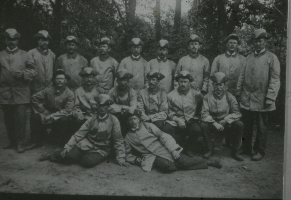 Bilden föreställer en grupp män uppställda på tre rader för fotografering framför en trädridå. Dem är klädda i likadana jackor och likadana hattar med uppvikta brätten.