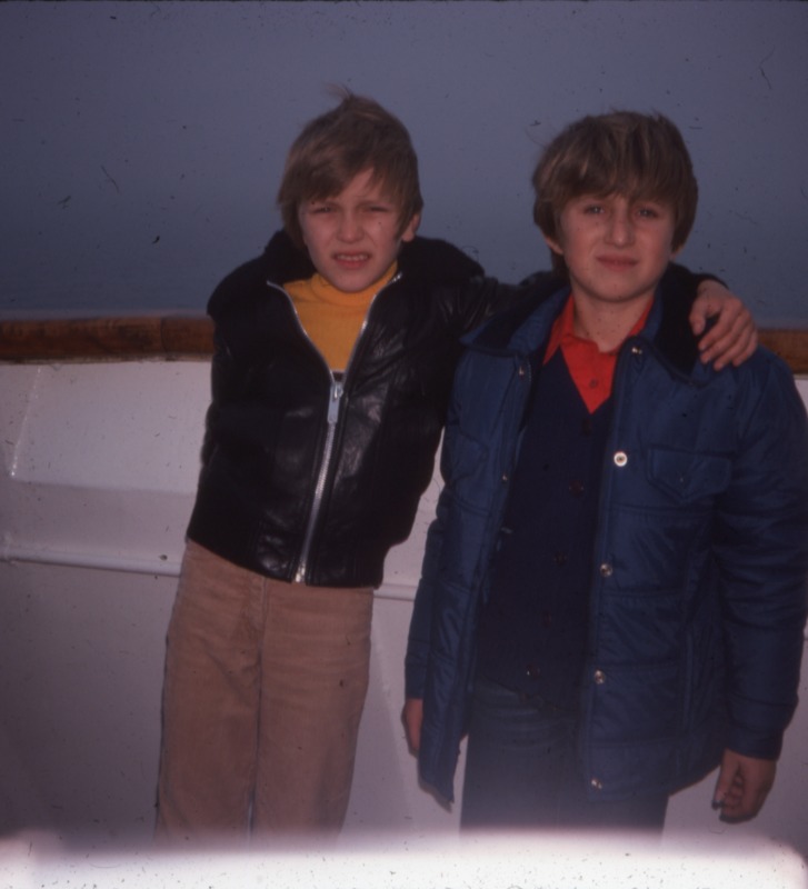 Bilden föreställer två barn i trekvartsformat som står vid relingen på en färja. På en lapp i asken står det LB-färjan, Sinisia och Zavisa.