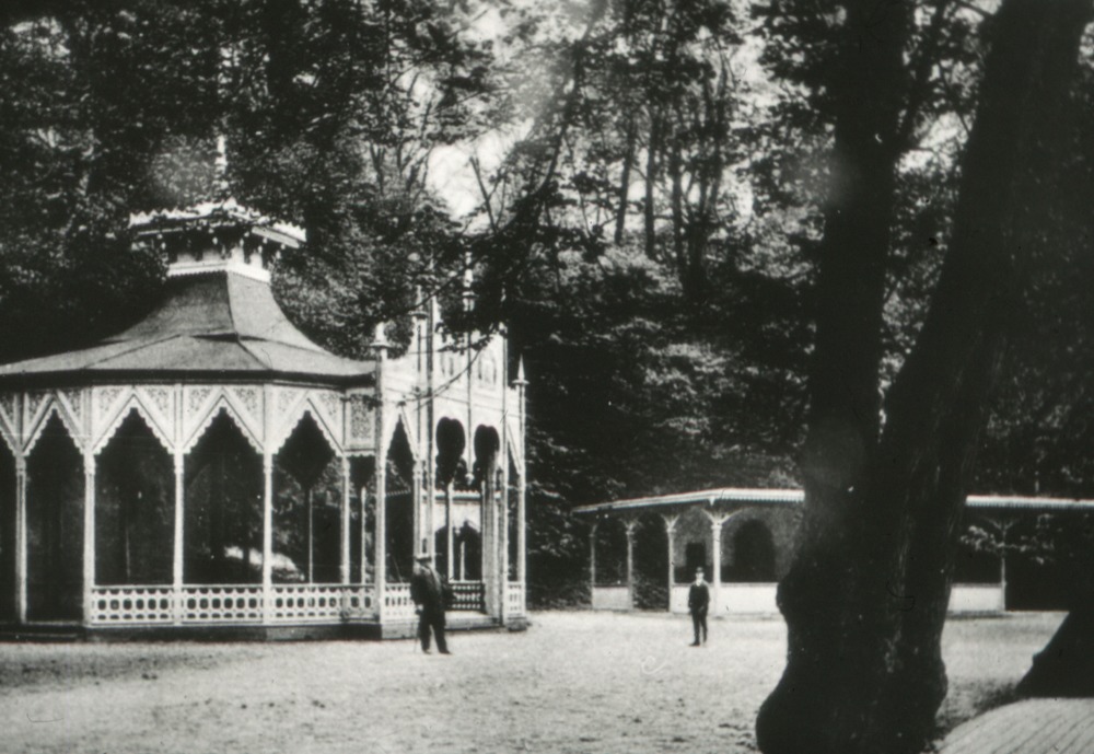 Bilden föreställer två paviljonger i en park. I bakgrunden träd. I förgrunden gångbana och trädstam. Där står två människor.