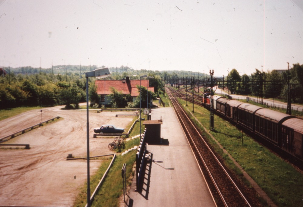Bilden föreställer till vänster en stor parkeringsplats med en bil. Till höger två järnvägsspår med järnvägsvagnar på det ena. Vid sidan av spåren en perrong. I bakgrunden en byggnad och parkområden.