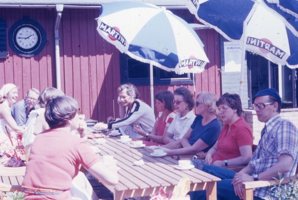 Bilden föreställer en grupp människor som sitter framför ett hus vid ett långbord och dricker kaffe. På väggen en klocka, till höger prarsoller. Troligen Pålsjöskog.