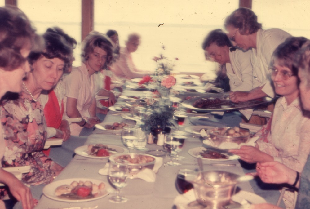 Bilden föreställer ett långbord inomhus där det sitter kvinnor. Bordet är dukat med matservis och glas, med mat på tallrikarna. Troligen vin i glasen och där står en blombukett. En kvinna serverar kött. I bakgrunden fönster. På bilden står det examenslunch, Parapeten 11-6-71.