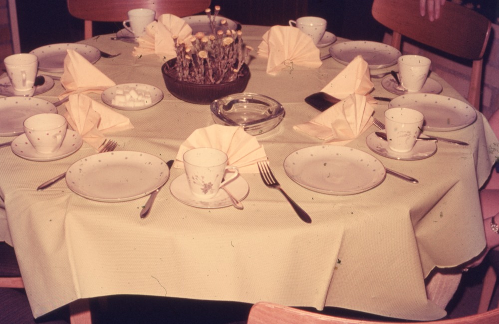 Bilden föreställer ett dukat bord. På den vita duken står kaffekoppar, asietter och bestick. Mitt på bordet blommor, tussilago? samt bitsocker och askkopp.
