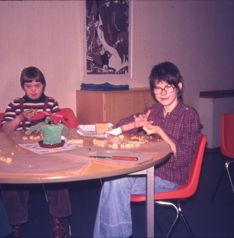Bilden föreställer ett rum med bord och stolar där det sitter två barn och tillagar något, kakor(?).