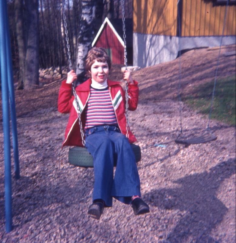 Bilden föreställer en lekplats i en park. En flicka sitter och gungar, grus undertill på marken. I bakgrunden hörna på hus samt träd.