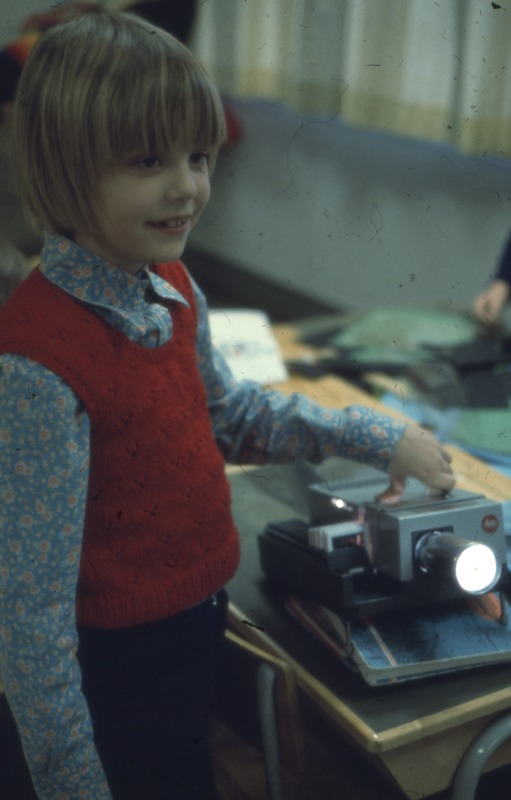 Bilden föreställer ett barn står vid en bänk med en diabildsprojektor.