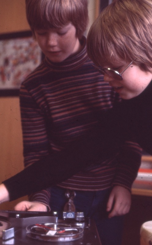 Bilden föreställer två pojkar i bröstformat. De står i ett rum. På ett bord framför dem står en bandspelare.