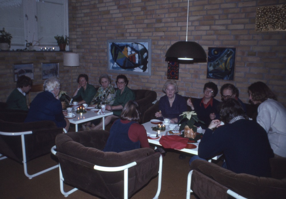 Bilden föreställer människor som sitter vid bord som är dukade med kaffekoppar och ljus samt en julstjärna. I bakgrunden fönster med neddragna perisenner och en tegelvägg. På bilden står det luciakaffe.