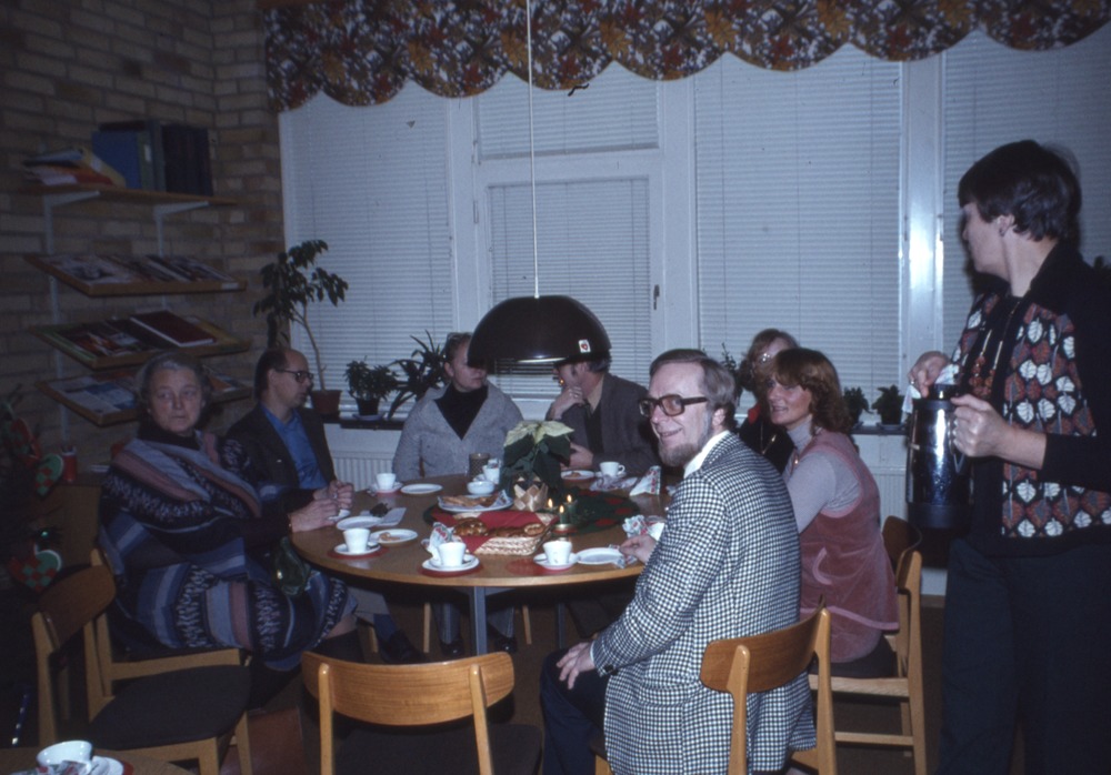 Bilden föreställer människor som sitter vid ett runt bord som är dukat med kaffekoppar och kakfat samt en julstjärna. En kvinna står med en kaffekanna. I bakgrunden fönster med neddragna perisenner. På bilden står det luciakaffe.
