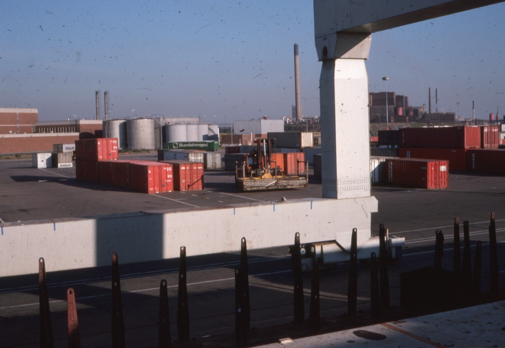 Bilden föreställer i förgrunden balkar troligen på en lyftkran, inuti står det järnvägsvagnar. Mitt i bild containrar. I bakgrunden silos och andra byggnader några med skorsten.