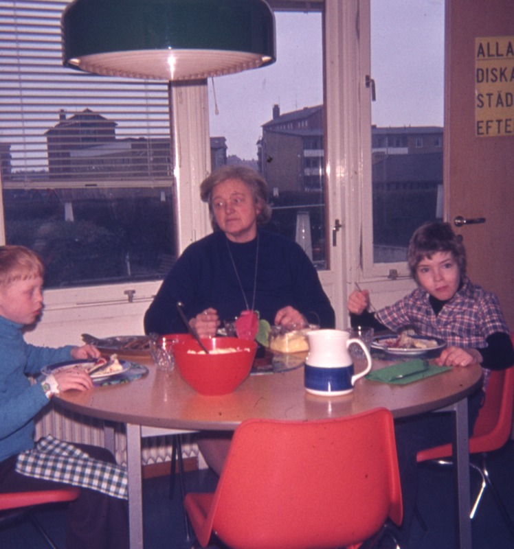 Bilden föreställer ett rum med bord och stolar där det sitter två barn och en lärare och äter på tallrikar med bestick. Där står en kanna och en skål. I bakgrunden fönster.