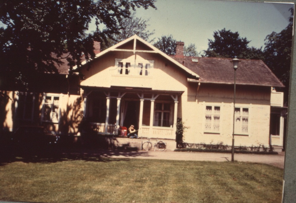 Bilden föreställer ett parkområde med träd och gräsmatta. I bakgrunden en och enhalvplansbyggnad, med veranda