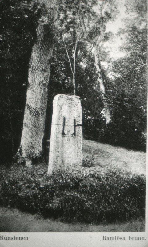 Bilden föreställer en runsten i högt gräs framför ett träd i en park. Under bilden står det "Runstenen, Ramlösa brunn"