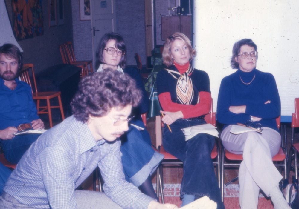 Bilden föreställer tre kvinnor och två män som sitter på stolar i en cirkel med papper och penna i händerna. På bilden står det Hjelmsjövik nov 1976, Studiedag.