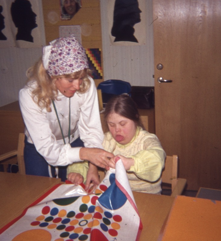 Bilden föreställer ett rum med bord. Vid bordet sitter ett barn och vecklar ut en duk med ett fiaspel. En lärare hjälper till.