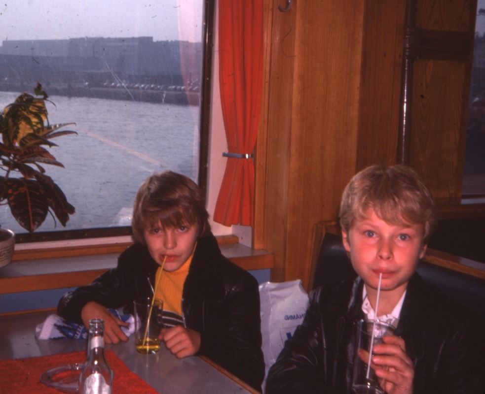 Bilden föreställer två barn i bröstformat som sitter vid ett bord med varsitt glas med sugrör. I bakgrunden fönster. På en lapp i asken står det LB-färjan, Sinisia och Zavisa.